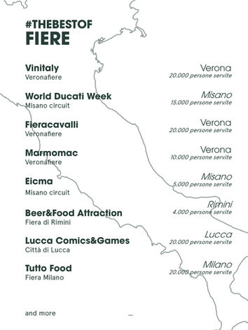 Lavoriamo con i nostri truck in tutta Italia fino a gestire oltre 30 postazioni; gestiamo catering di ogni dimensione: da 2 a oltre 100.000 persone; presidiamo l’area food di decine di eventi di portata nazionale e internazionale.